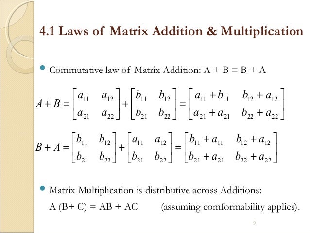 Matrix multiplication is distributive over matrix addition ie i ABCABAC. Also if A be an m n matrix and B and C be n m matrices then. Distributive law of matrix multiplication - law.